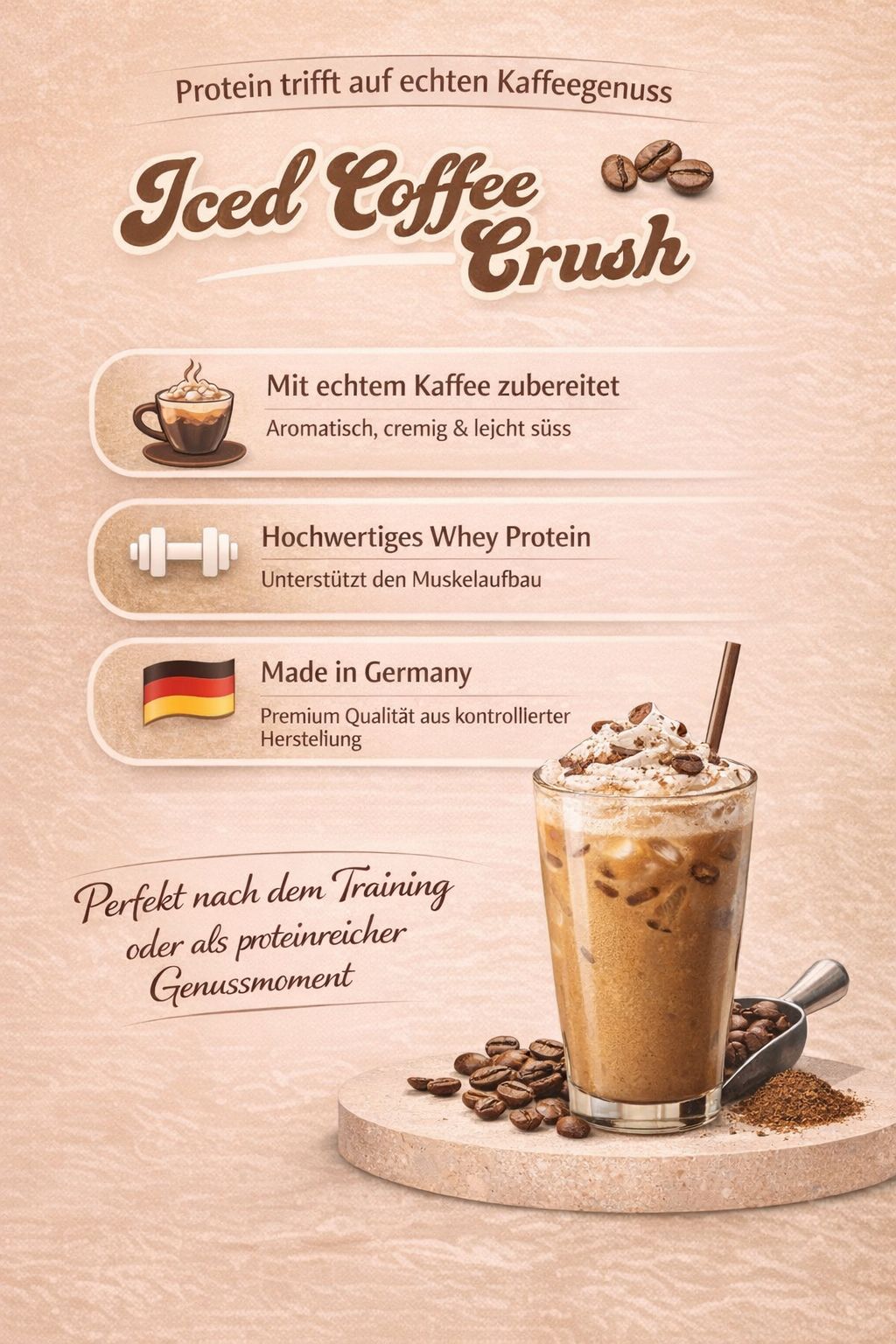 Die feine Kaffeenote sorgt für einen natürlichen Koffein Kick und macht den Drink ideal als erfrischende Alternative zu klassischen Proteinshakes. Besonders eisgekühlt entfaltet sich der Geschmack wie ein moderner Iced Coffee: aromatisch, cremig und unglaublich angenehm zu trinken.